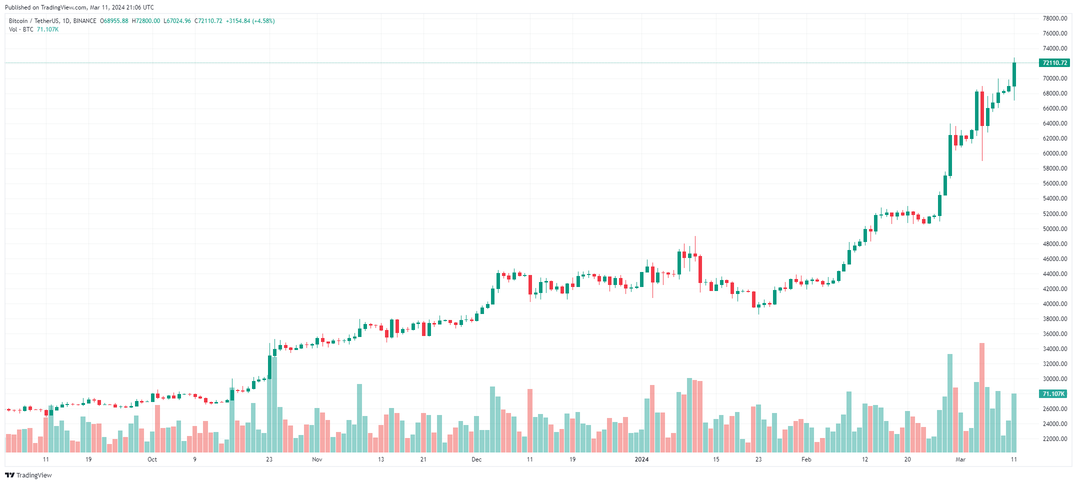 La semana arranca con el precio de Bitcoin alcanzando un pico sin precedentes de 72,500 dólares, al cierre de la redacción.