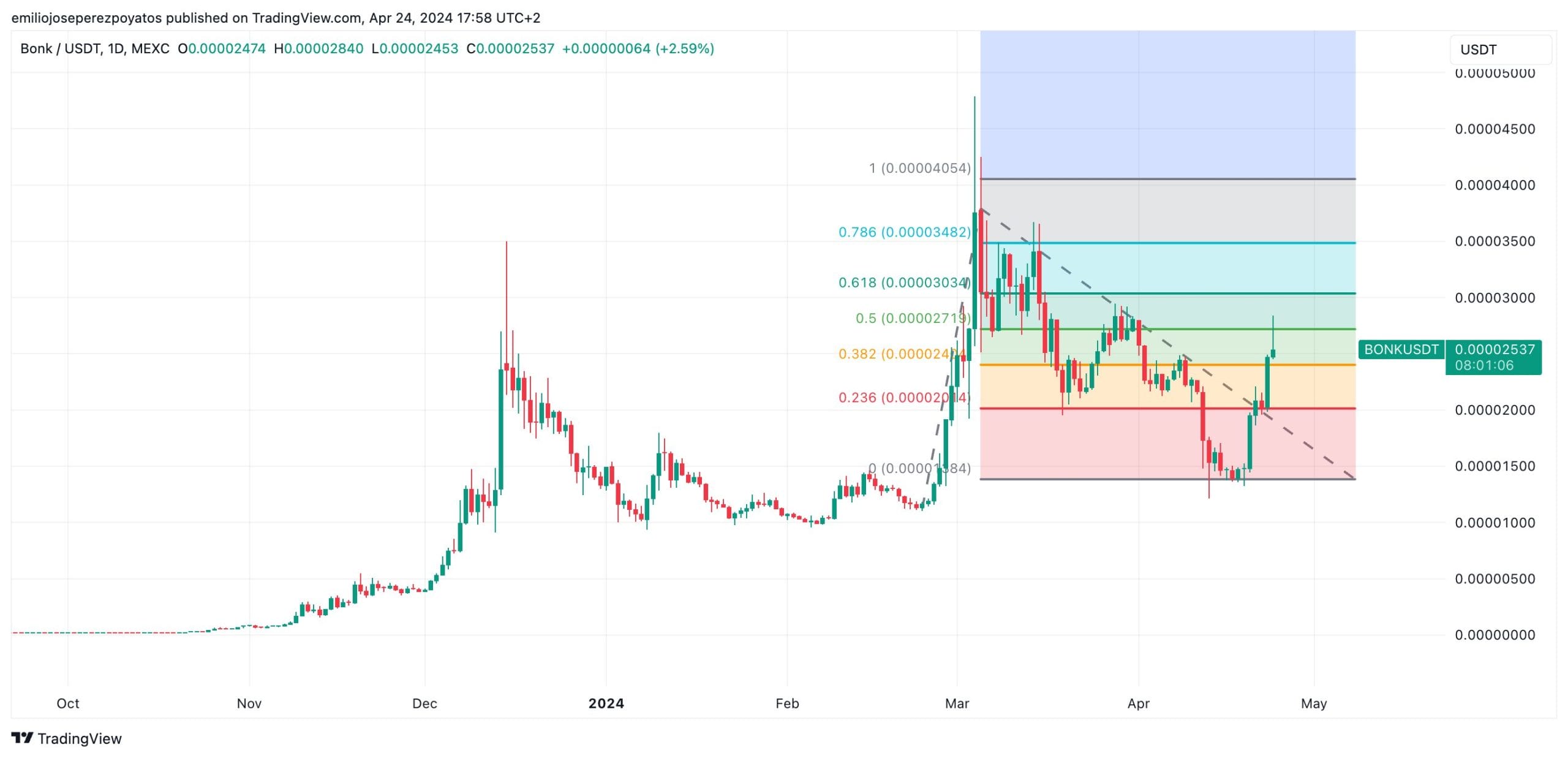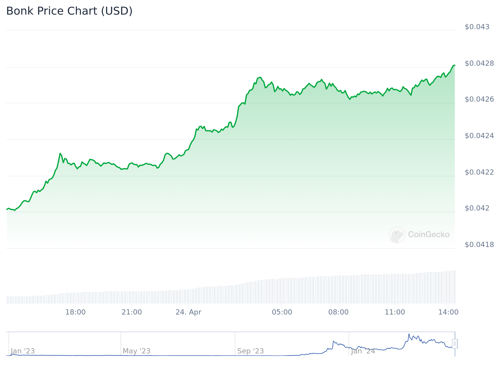 En las últimas horas hemos podido comprobar cómo el precio de Bonk Coin recuperaba la fuerza con la que se desenvolvía en el último tercio del pasado año. Sólo un día ha hecho falta para que su revalorización alcance el +38%, situando el precio actual de la criptomoneda en la órbita de 0,000028 $.