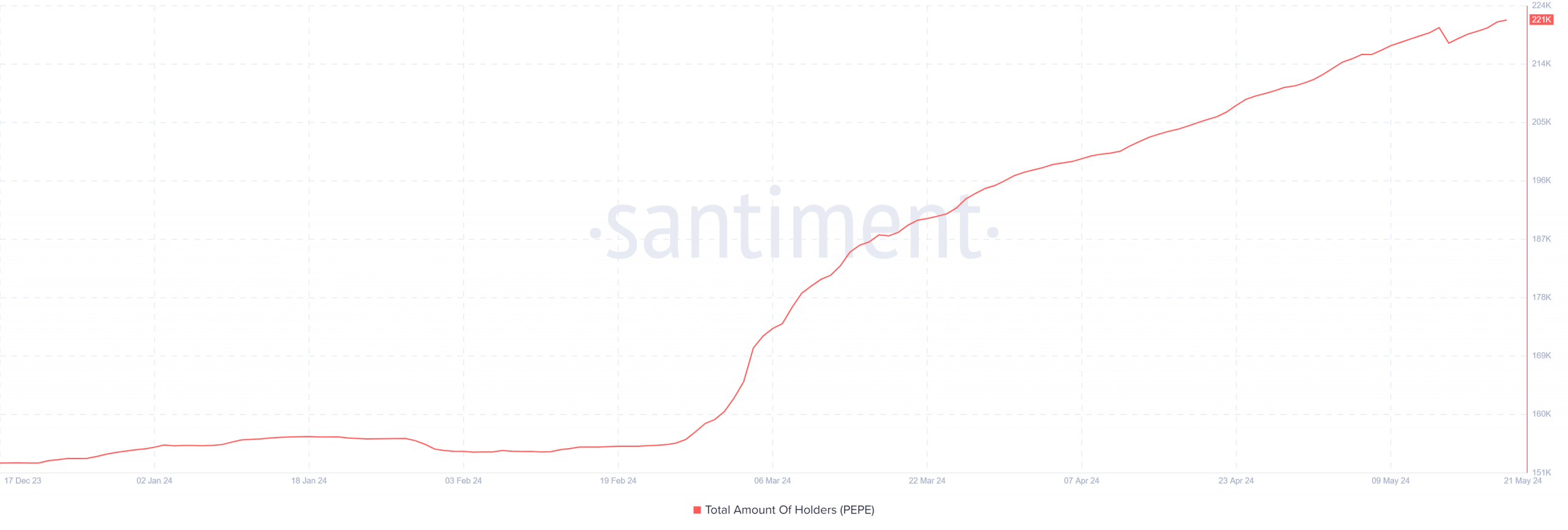 Otro elemento que ha influido en el aumento del precio de Pepe coin ha sido sin duda el fuerte incremento de holders. Según datos de Santiment, estaríamos ante más de 221.000 tenedores de $PEPE en este momento: