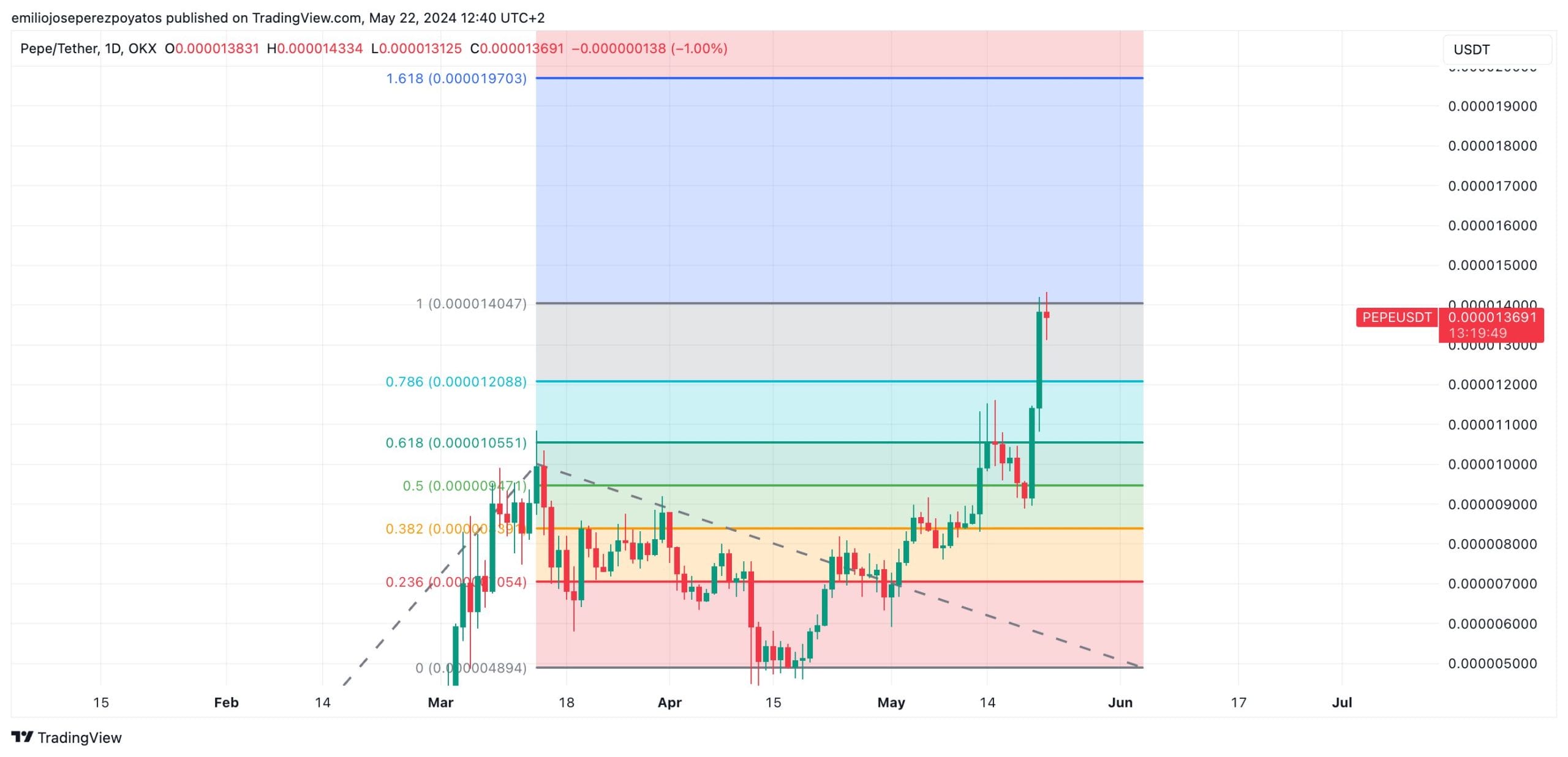 Dada la excelente tesitura en que se encuentra $PEPE, la extensión de Fibonacci nos refleja un potencial de crecimiento bastante prometedor. Por supuesto no hablamos de que el alza se vaya a acometer en línea recta, y es lógico pensar que parte de los inversores que arrastran más revalorización quieran capitalizar beneficios, pero en cualquier caso los objetivos son claros y alcanzables.