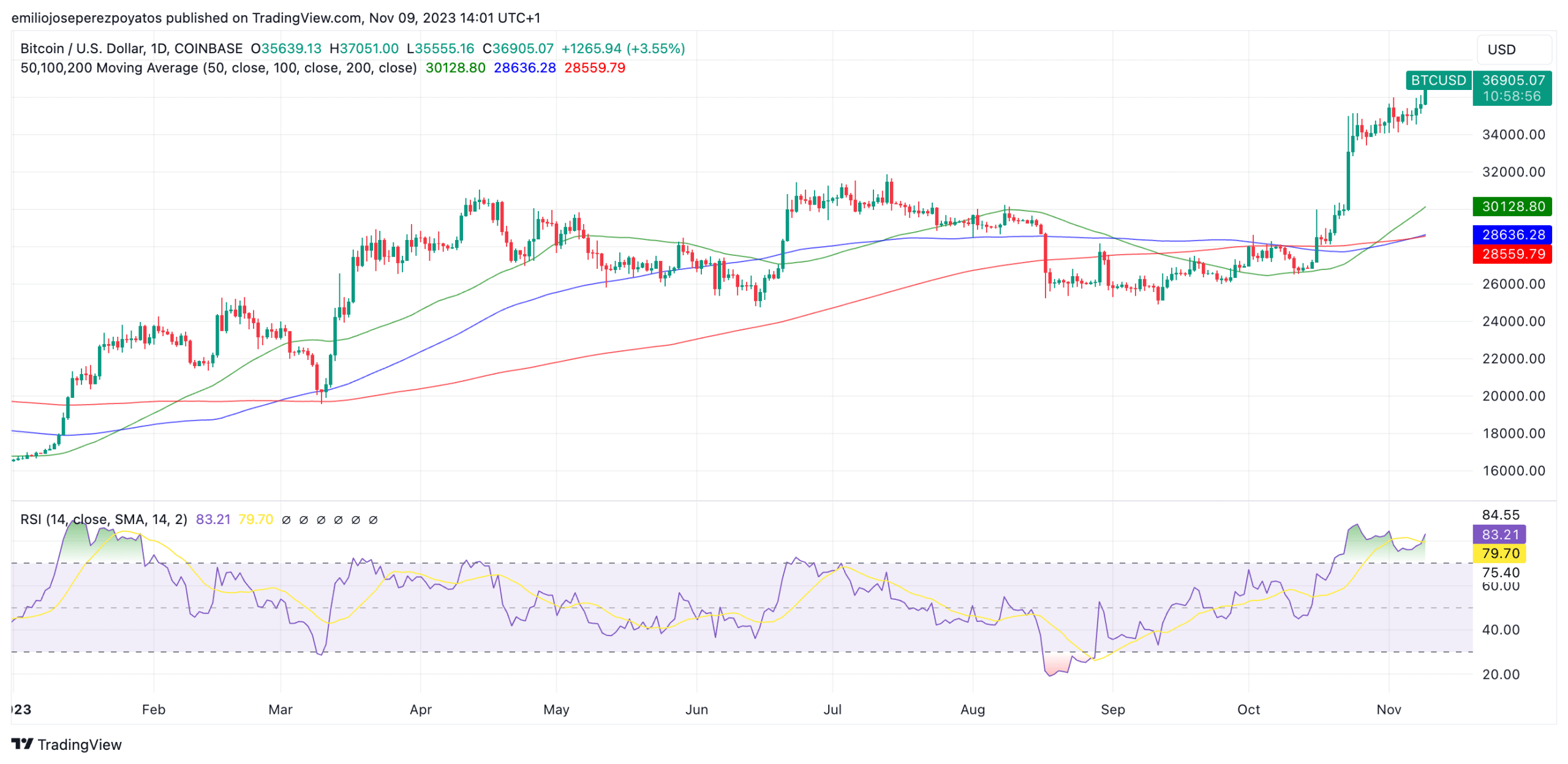 Por otro lado, el Bitcoin ha logrado incrementar su precio un +122% y sobrepasa una vez más los niveles de 36.000 $.