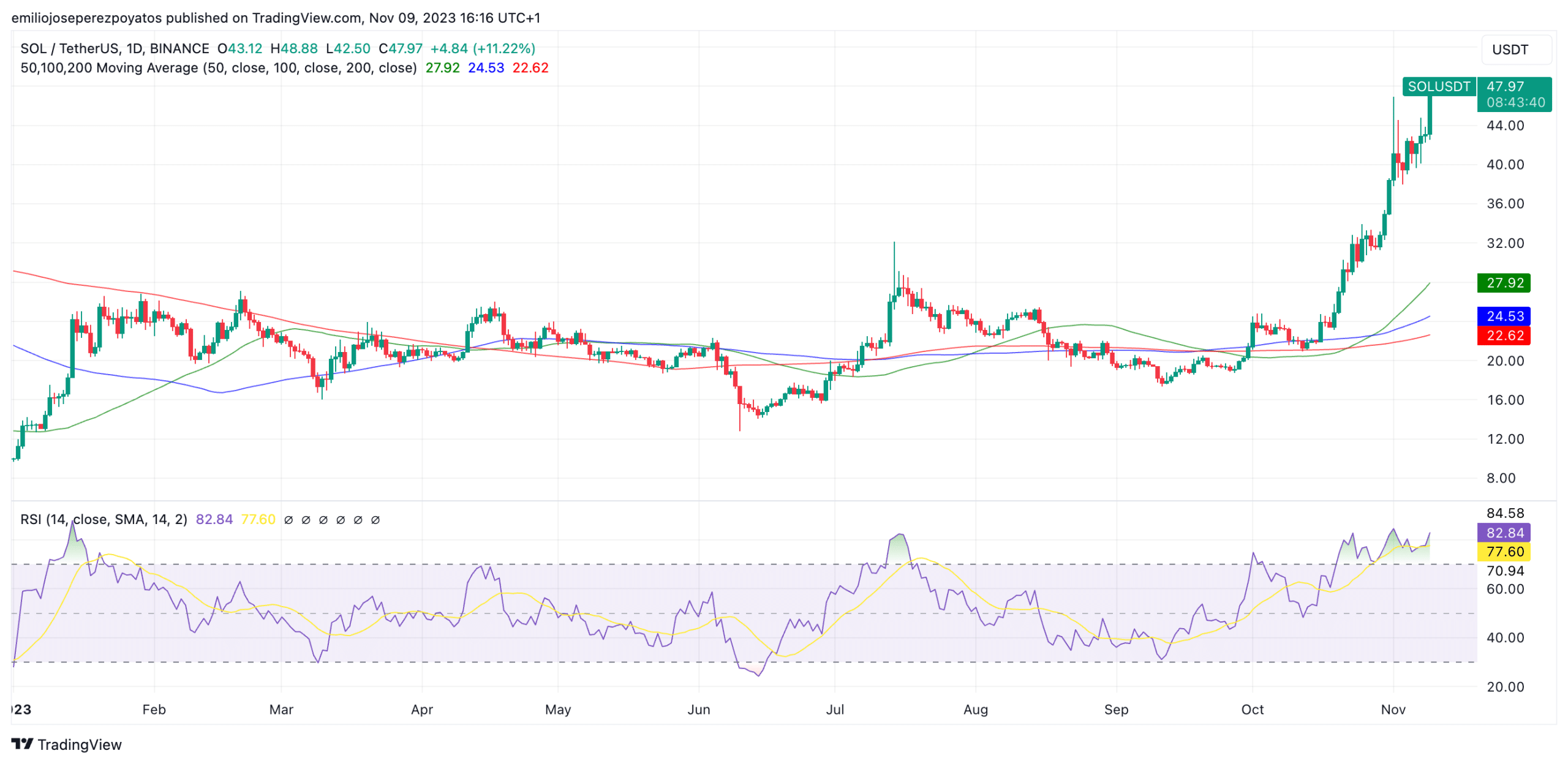 El análisis que desprende la gráfica de Solana guarda similitudes con Bitcoin, siendo como además SOL está entre las criptomonedas con mayor potencial. Aquí también tenemos un precio que ha logrado romper las medias móviles a 50, 100 y 200 sesiones, además con un amplio margen.