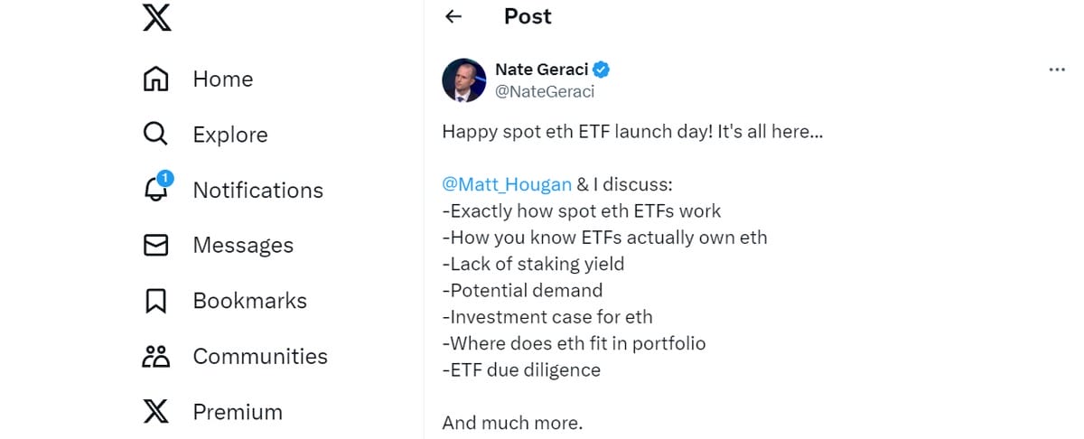 Nate Geraci, presidente de The ETF Store, expresó un gran optimismo sobre el futuro de los ETF Ethereum y afirmó: “No espero el mismo frenesí que con los ETF de Bitcoin, pero si los ETF de Ethereum atraen entre el 20 y el 25 % de los activos de los ETF de Bitcoin, sería un resultado muy exitoso”. Su sentimiento fue compartido por Markus Thielen, fundador de 10x Research, quien señaló que la menor tasa de financiación de Ethereum podría afectar el interés institucional. Sin embargo, los fuertes volúmenes iniciales indican una sólida demanda de estos nuevos productos financieros.