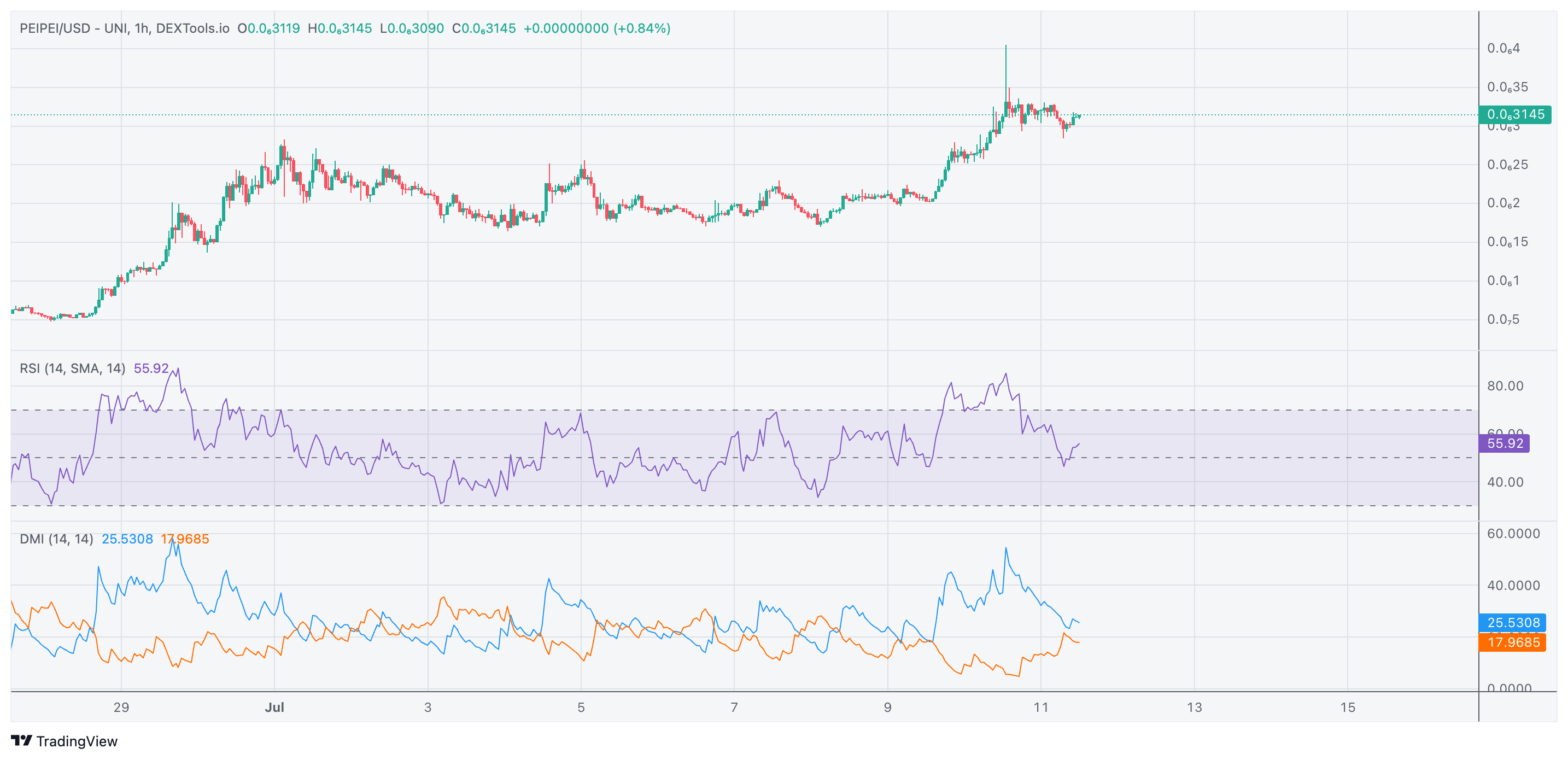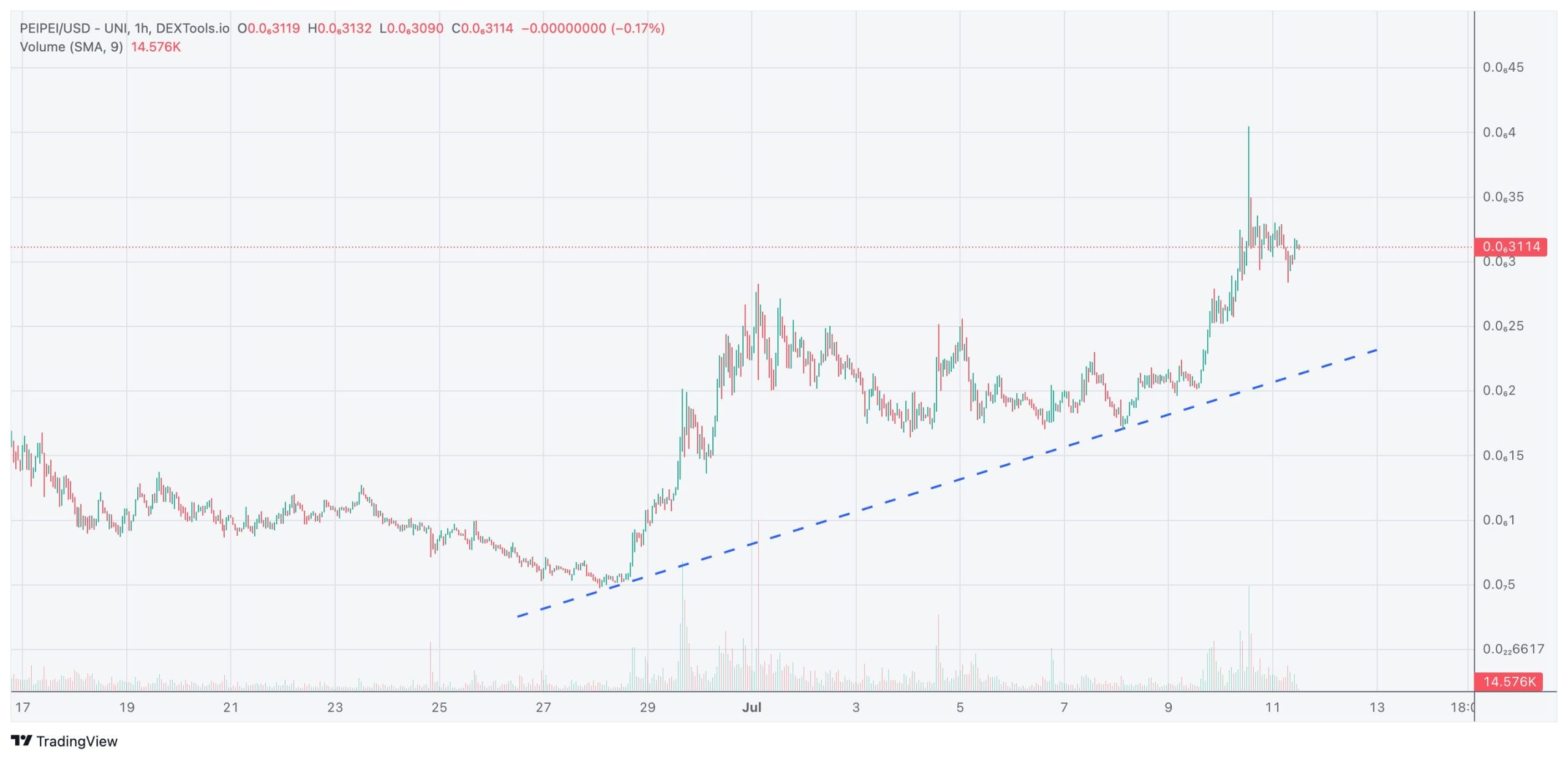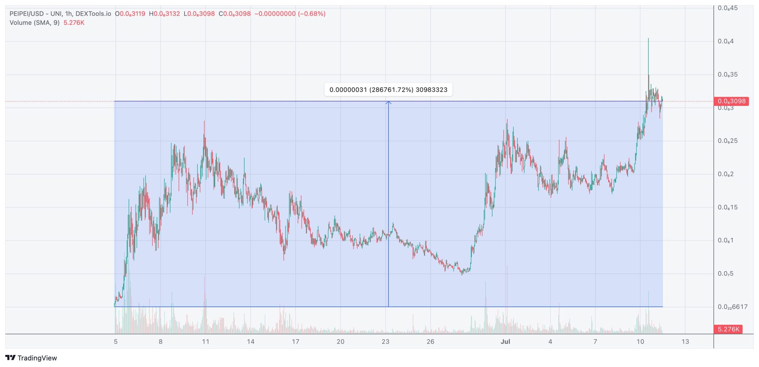 Quien hubiera tenido la suerte de estrenar PeiPei cripto el mismo día de su negociación de Uniswap tendría ahora mismo una revalorización superior al +286.000%, tal y como muestran las pantallas de DexTools: