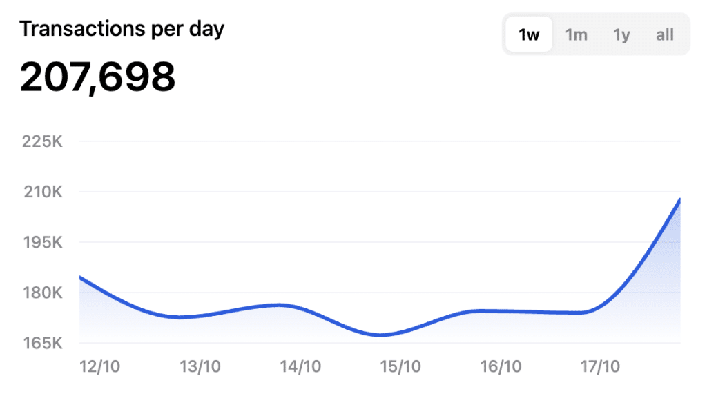 Según los datos que publica TonStat, en la última semana hemos visto un repunte en dos apartados clave. El primero de ellos sería el número de transacciones diarias, que pasa de 184k al inicio de la observación a los 207k actuales: