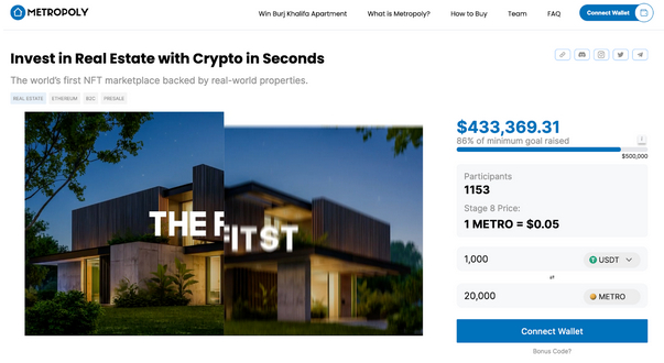 Con la preventa de Metropoly casi alcanzando el hito de los 500.000 dólares, está en camino de cambiar para siempre la forma de invertir en bienes inmuebles. El revolucionario mercado de NFT de Metropoly permite a los inversores comprar fácilmente NFT respaldadas por bienes inmuebles que proporcionan unos ingresos totalmente pasivos.