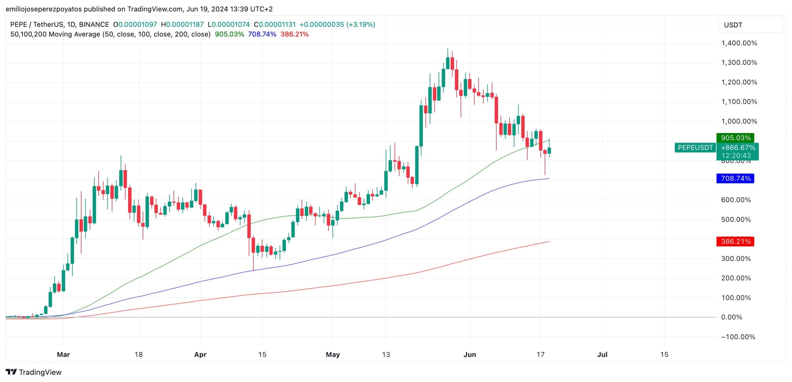 Detalle de cotización de PEPE con medias móviles / Fuente: TradingView