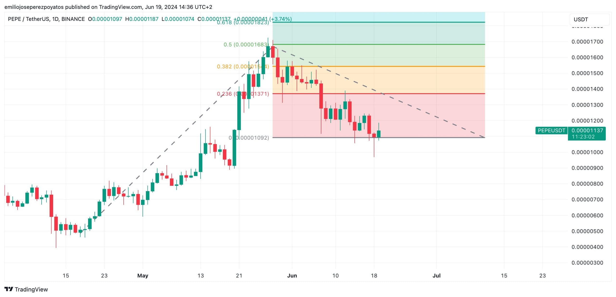 Aplicando la extensión de Fibonacci, podemos observar como hay un nivel clave a perseguir en una potencial recuperación, y es el de los 0,00001544 $. A partir de ahí, vamos a poder encontrar un hueco perfecto para romper los máximos ATH y entrar en una nueva espiral alcista que podría hacer de PEPE una de las mejores criptomonedas para invertir en 2024: