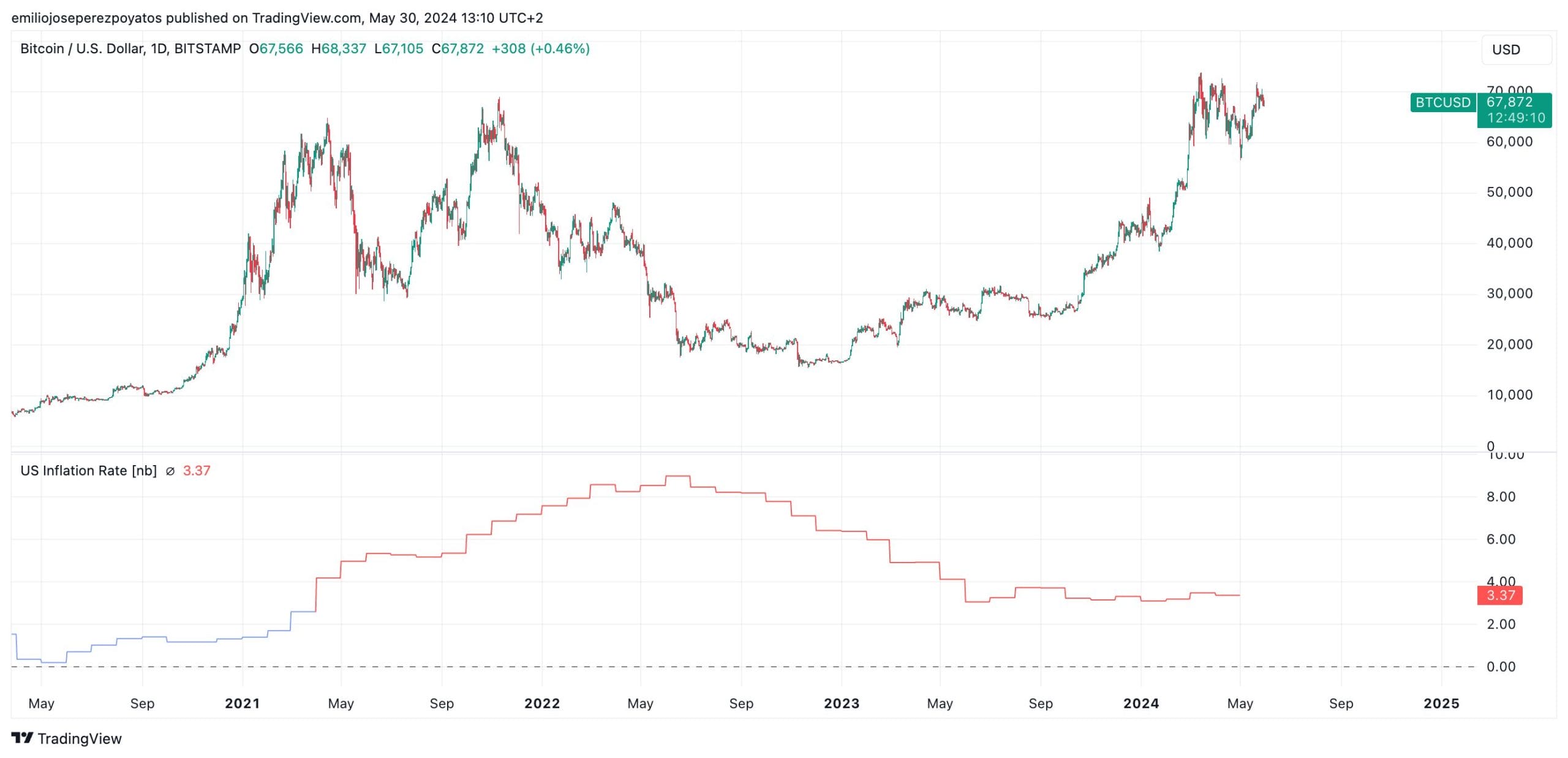 El próximo 12 de junio se efectuará la siguiente publicación de los datos de IPC, según sea el resultado podremos ver a Bitcoin moviéndose hacia un lado u otro. Según un informe de 10x Research, si la inflación es del 3,3% o menor existen serias posibilidades de ver a la criptomoneda reina en un nuevo rally que le lleve a rebasar los máximos ATH. De lo contrario, si la inflación crece es posible que pongamos nuevamente a prueba los soportes.