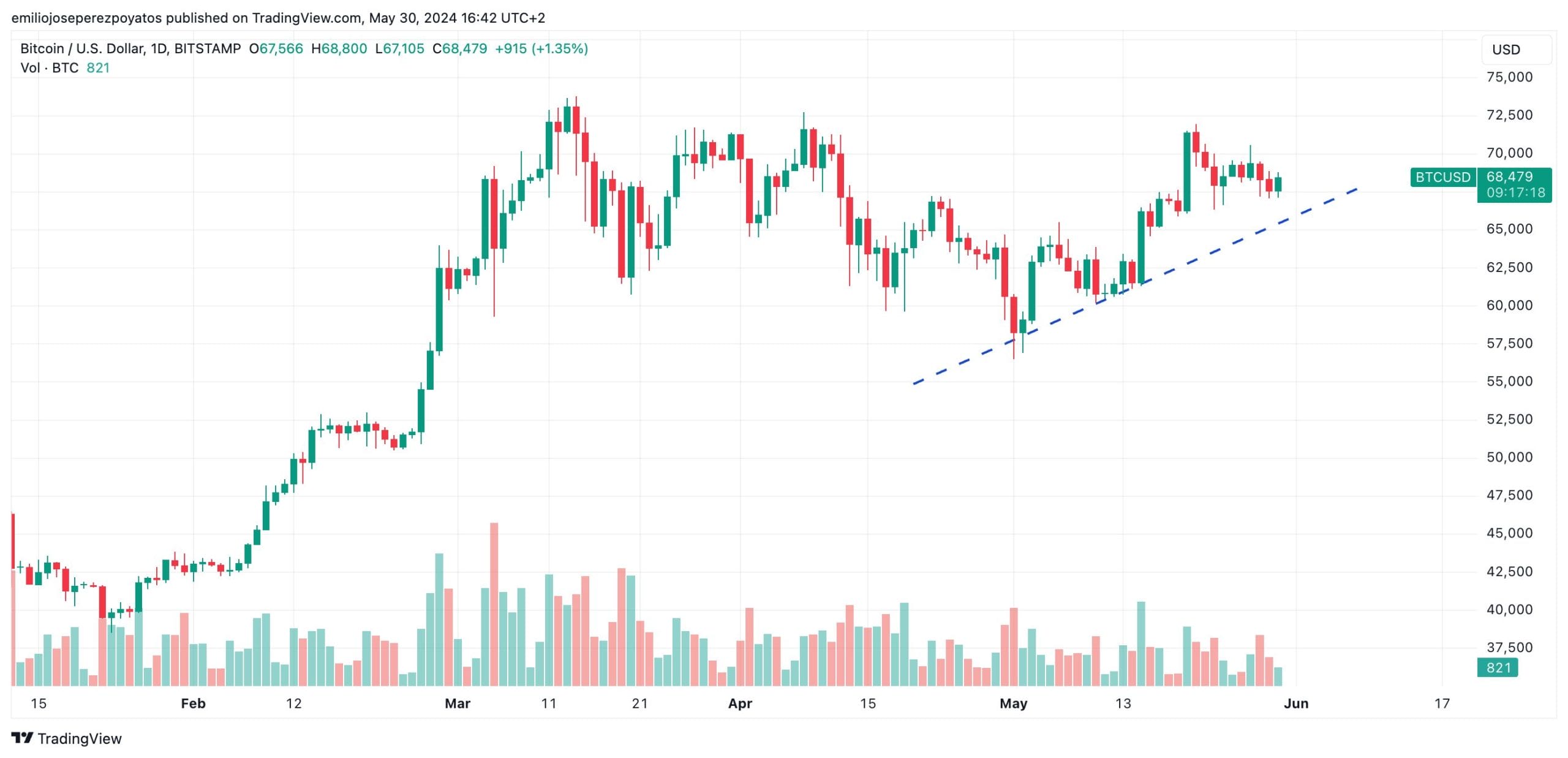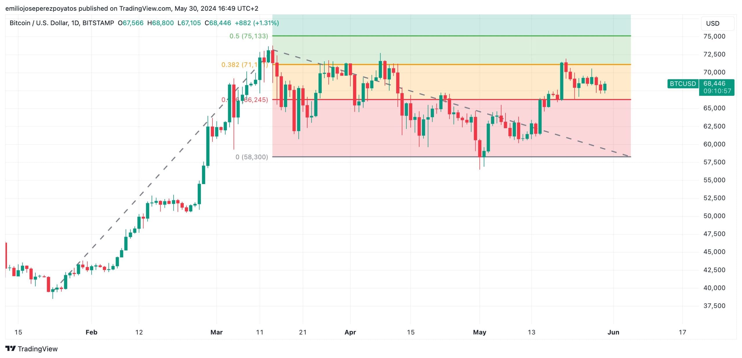 El rango de oscilación es bastante amplio. Con Fibonacci observamos cómo el trazado abarca desde los 58.300 $ en la parte baja hasta los 71.200 $ como punto de resistencia. Necesitamos pues un catalizador para poder romper con esa barrera y proseguir hasta los nuevos máximos ATH, que serían sobrepasados ya los 75.000 $: