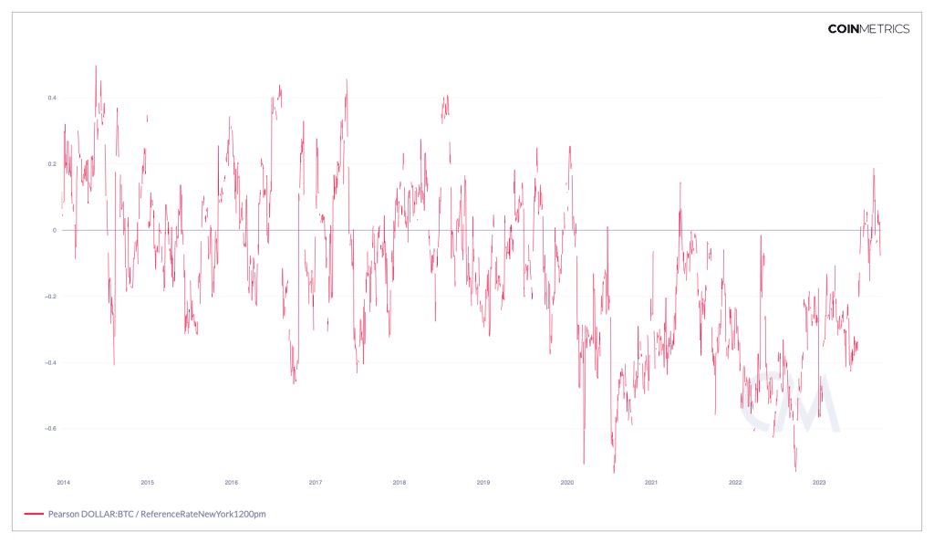 Comenzando por el Dollar Index, índice que mide la fortaleza de la moneda verde, vemos que el coeficiente Pearson a 30 días marca una correlación negativa de -0,07 puntos. Cabe recordar que el Dollar Index se elabora a través de la media ponderada de su evolución frente a seis monedas fiat, incluyendo EUR, GBP o CHF: