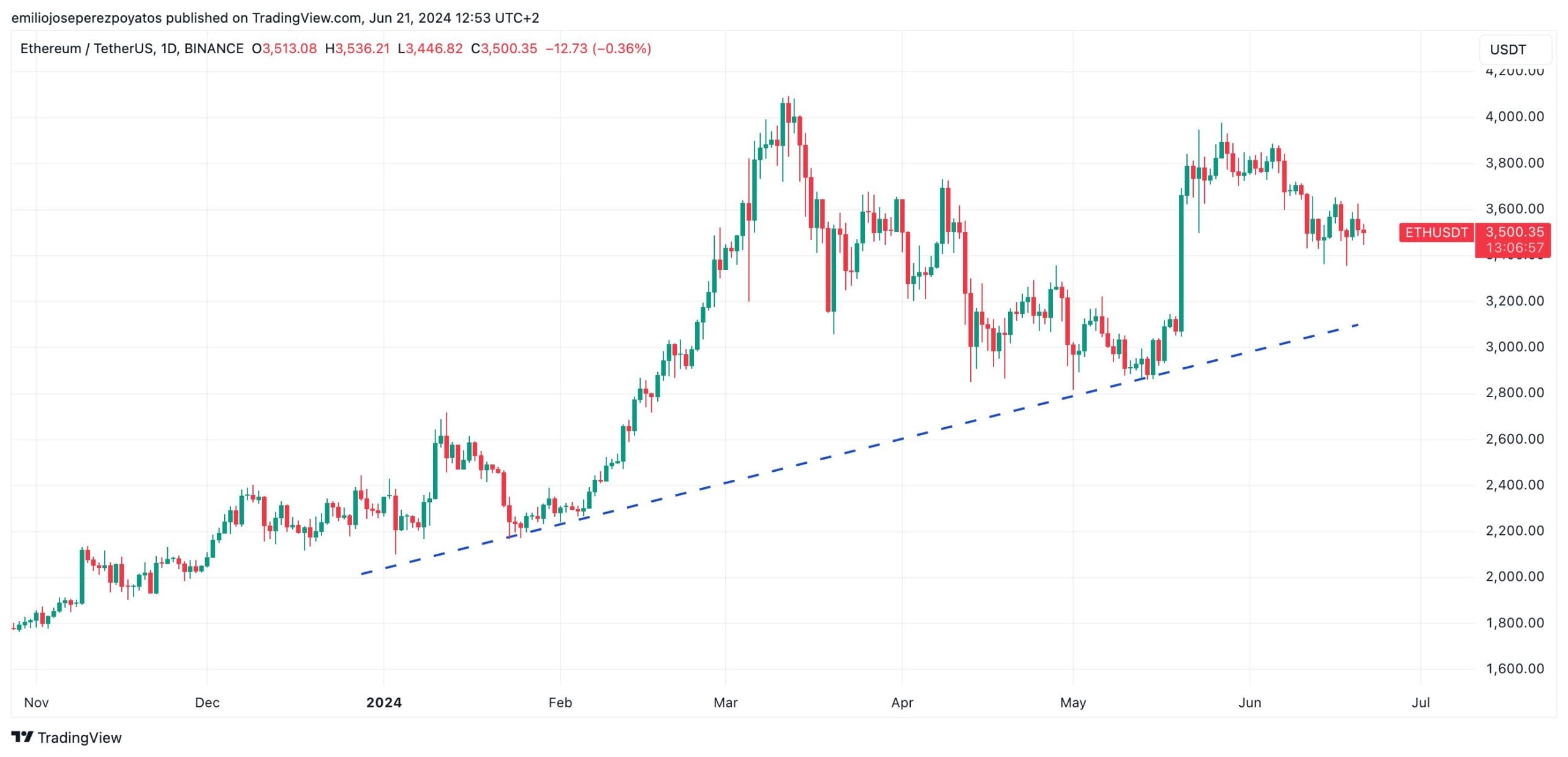 Lo primero en lo que reparamos cuando observamos la gráfica de Ethereum hoy es en el soporte tangencial alcista que le acompaña desde hace meses. Por el momento parece que el trazado tiene intención de seguir respetándolo, y movimientos como el del pasado día 20 coadyuvan en ello: