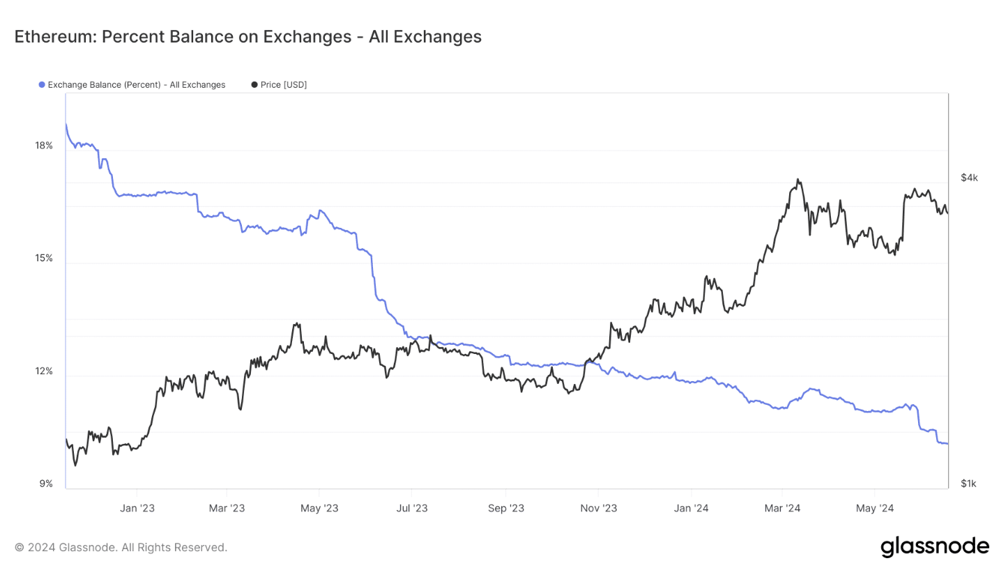 Además, también hemos podido comprobar a través de Glassnode que el porcentaje de ETH disponible para intercambio en exchanges está en su tasa más baja de los últimos 8 años. Concretamente se situaría en el 10,19%. Esto es una excelente noticia para los inversores a largo en ETH, pues no hace sino reflejar que se detrae la venta y los tenedores de Ethereum optan por acumular, en un previsible movimiento por optar a mayores precios a futuro.
