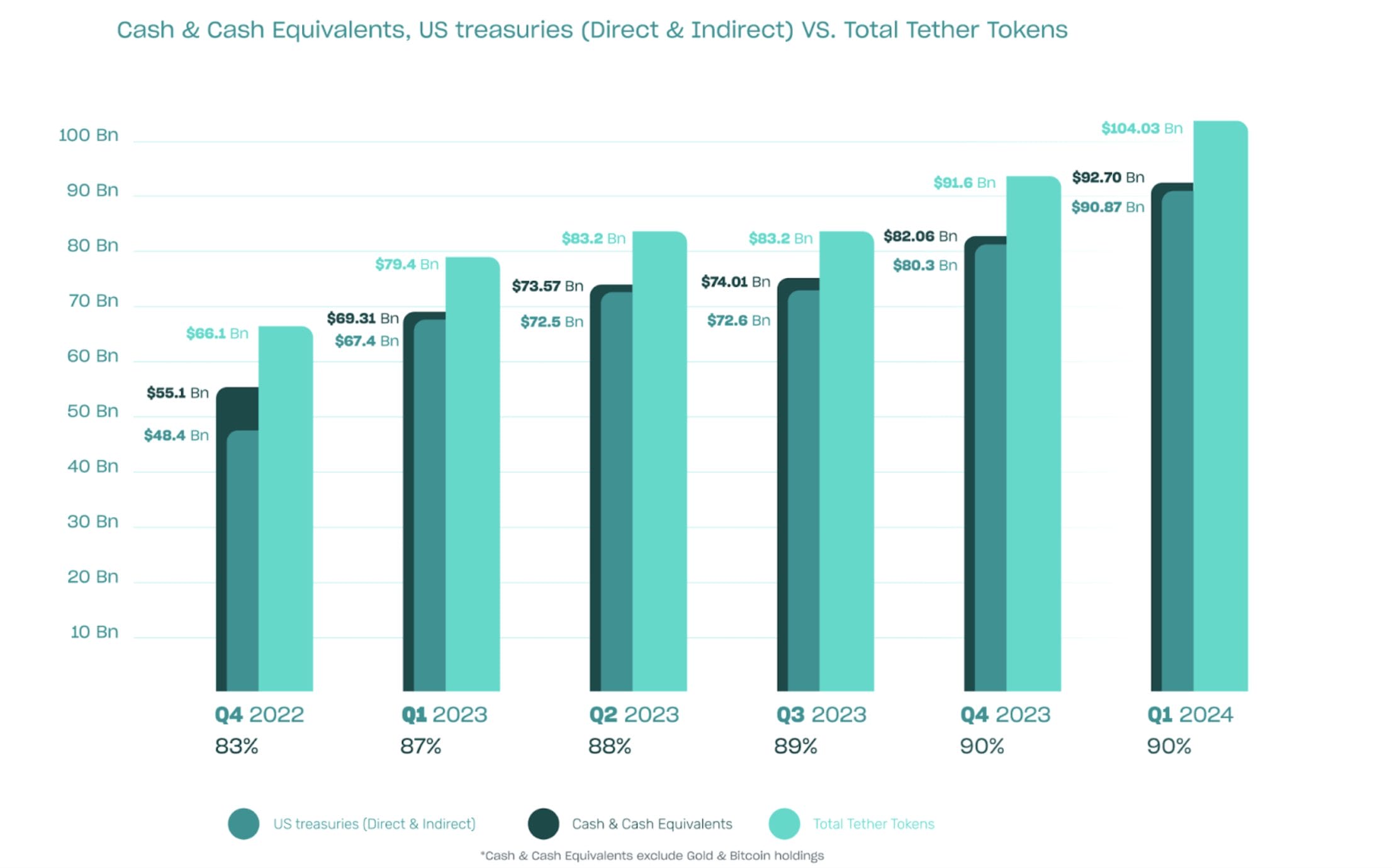 Llama la atención el progresivo incremento del ratio de reservas frente a la emisión de USDT. Dicho ratio lo que viene es a sumar el efectivo, el efectivo equivalente y las tenencias en bonos estatales (tenencia directa e indirecta) comparándola con el volumen de USDT en circulación. Tal y como podemos observar en la siguiente gráfica, hemos pasado del 83% en el cuarto trimestre de 2022 hasta el 90% del primer trimestre de 2024: