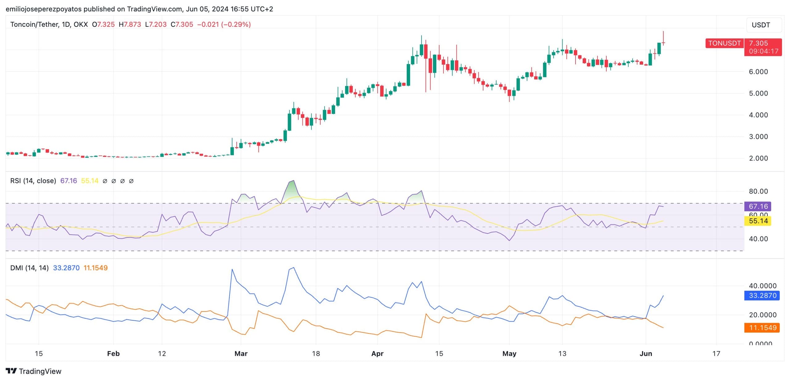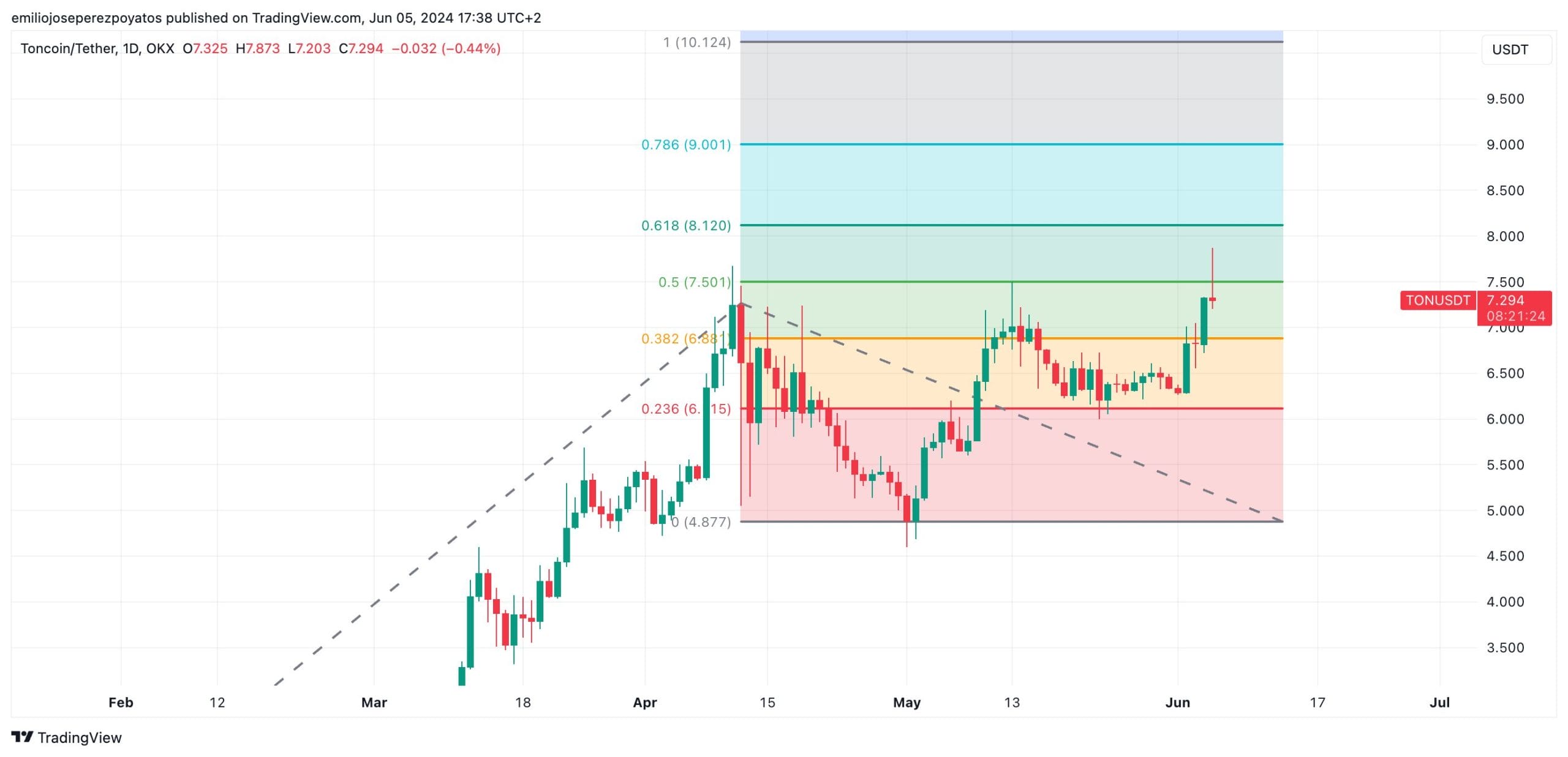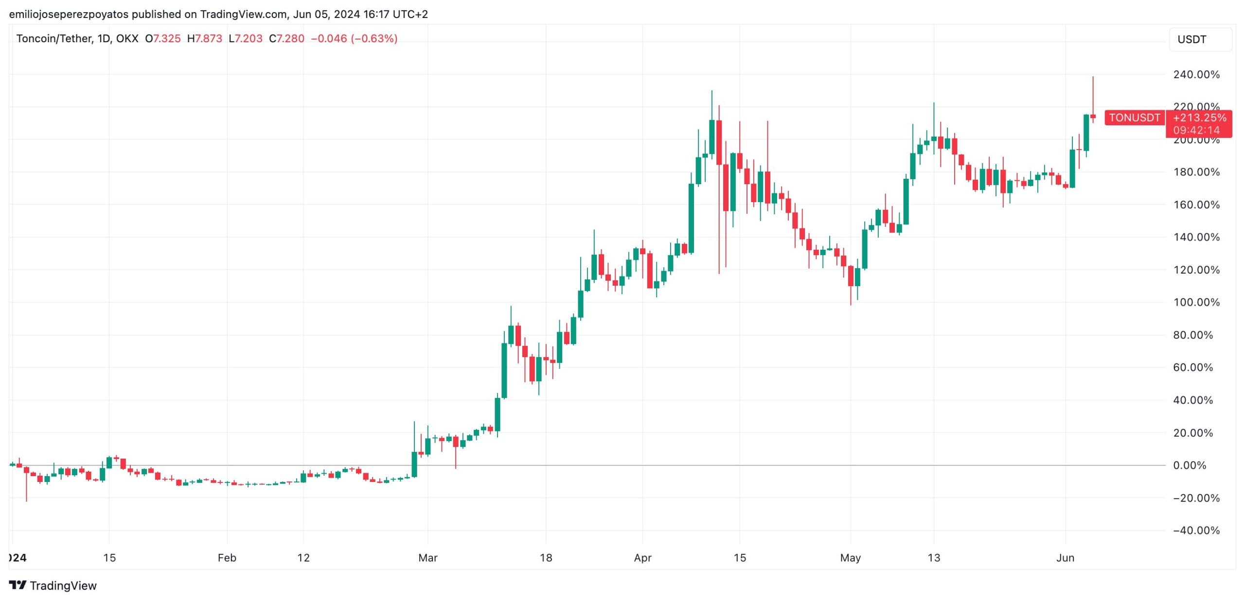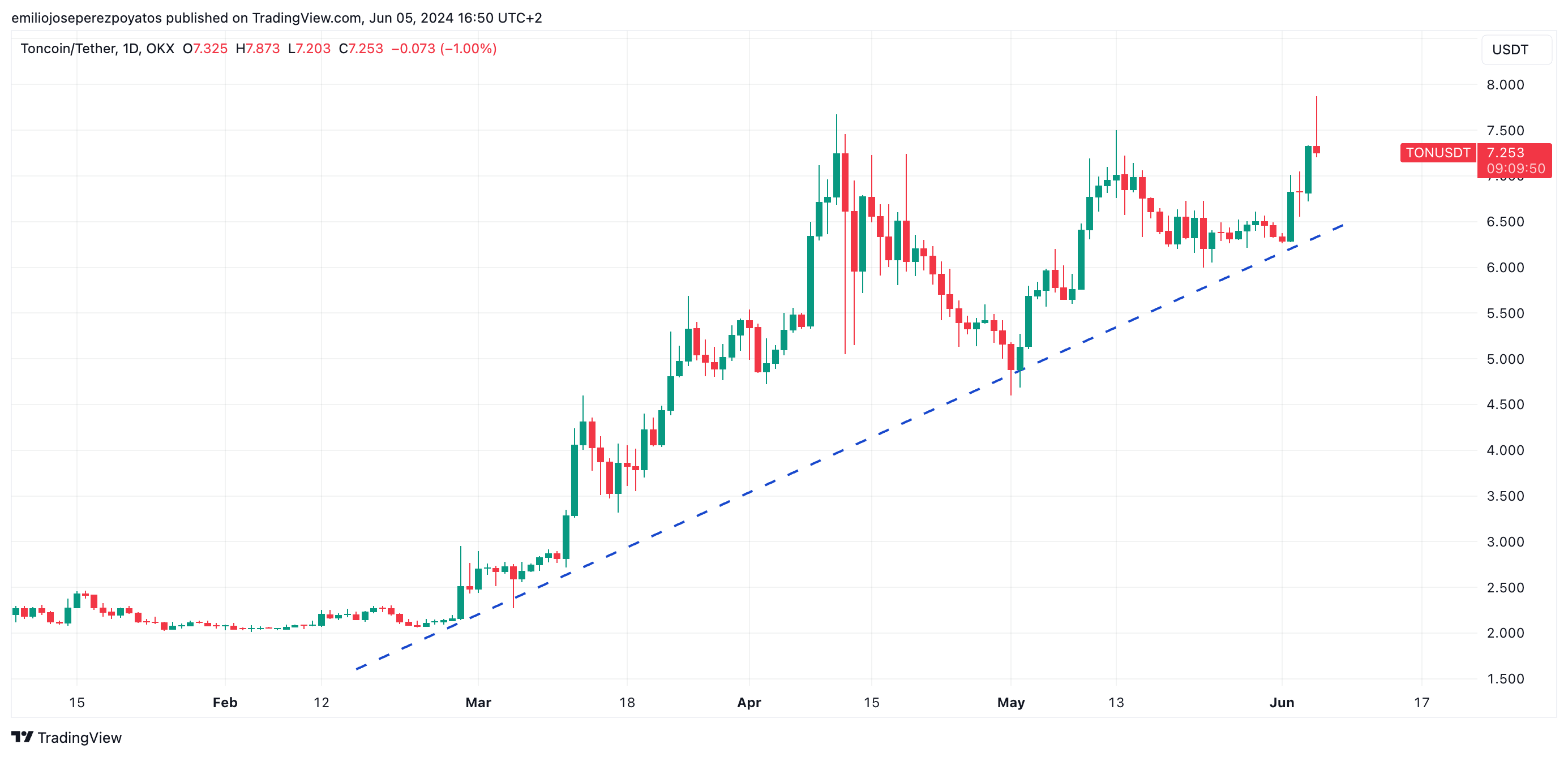 Parece que corren buenos tiempos para Toncoin. La que fuere en su momento criptomoneda oficial de Telegram, luego ya gestionada por una fundación independiente, ha experimentado una potente revalorización en las últimas horas llegando a rebasar el 10%. Paralelamente, el volumen de negociación creció un +140%, y se alcanzaron nuevos máximos ATH en los 7,76 $.