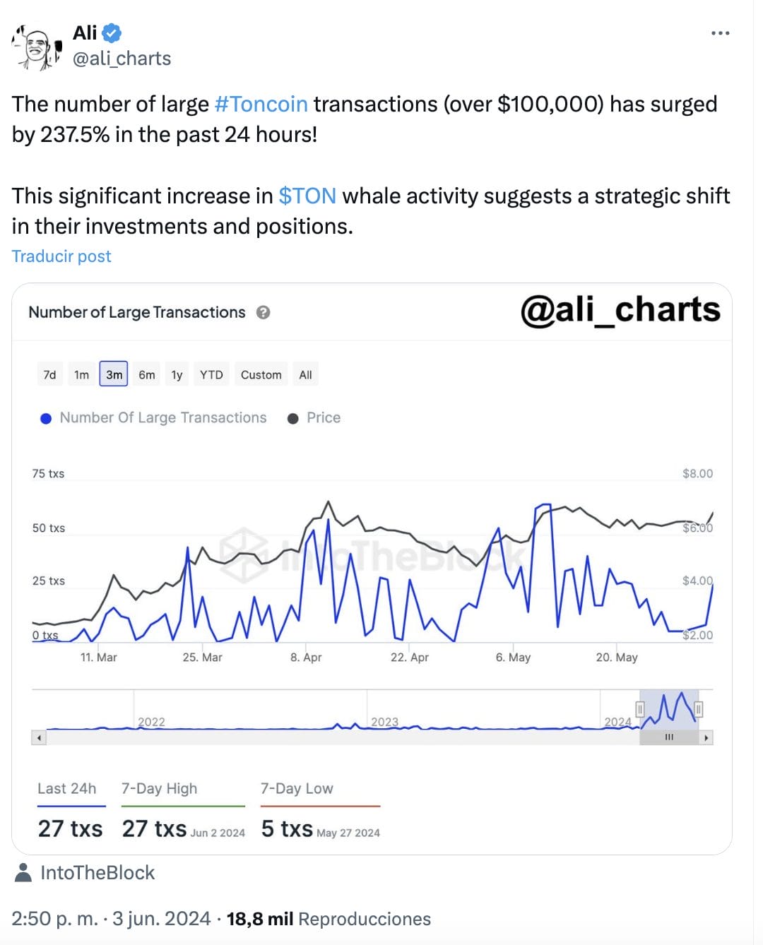Aunque son distintos los factores que intervienen en la configuración del precio de TON, parece ser que detrás de los movimientos recientes estaría la actividad de las ballenas cripto. Según comentó el analista AliCharts a través de redes sociales, los movimientos de Toncoin por encima de 100.000 dólares se incrementaron un +237,50% en sólo 24 horas.