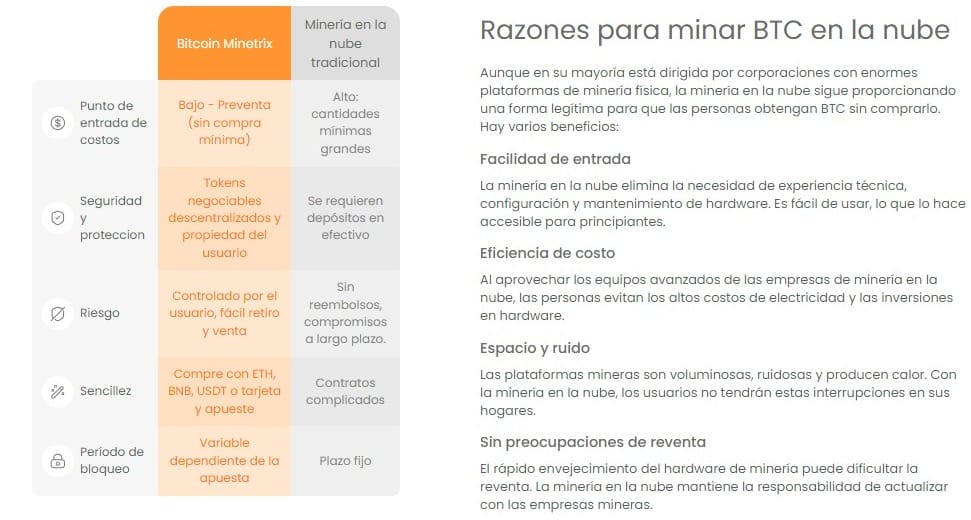 El caso de uso de vanguardia de Bitcoin Minetrix es el factor impulsor detrás de su publicidad. El proyecto se basa en la minería en la nube y ofrece una alternativa perfecta y fácil de usar para principiantes a la minería tradicional de Bitcoin.También mejora las soluciones de minería en la nube existentes en la industria, lo que convierte al token $BTCMTX en una compra obvia para muchos participantes del mercado.Los usuarios compren y apuesten $BTCMTX a cambio de créditos de minería de Bitcoin. Luego pueden invertir estos créditos para obtener su parte de las recompensas del grupo de minería en la nube. Esencialmente, esto forja una forma de poder minero tokenizado de Bitcoin