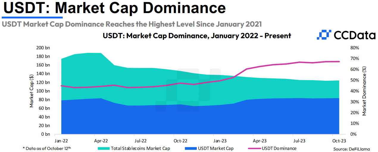 De acuerdo a información revelada en un informe hecho por CCData, la dominancia de USDT sobre el resto de stablecoins ha alcanzado su mayor nivel desde enero de 2021.