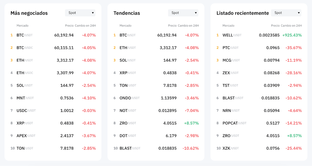 Asimismo, es posible encontrar a las principales criptomonedas por volumen de capitalización del mercado. Y la posibilidad de acceder a un apalancamiento de hasta x100 con Bitcoin y de x50 para las mejores altcoins. Su buscador permite diferenciar en spot o contratos para encontrar la criptodivisa deseada.