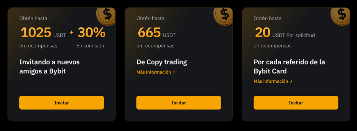 Por último, no querrás perderte el programa de referidos de Bybit. Son incentivos para quienes inviten a otras personas a unirse como cliente de la plataforma. Haciendo que otros lleguen, es posible ganar hasta 1.710 USDT en recompensas. Además de un 30% en comisiones cuando los referidos completan una operación en Bybit.