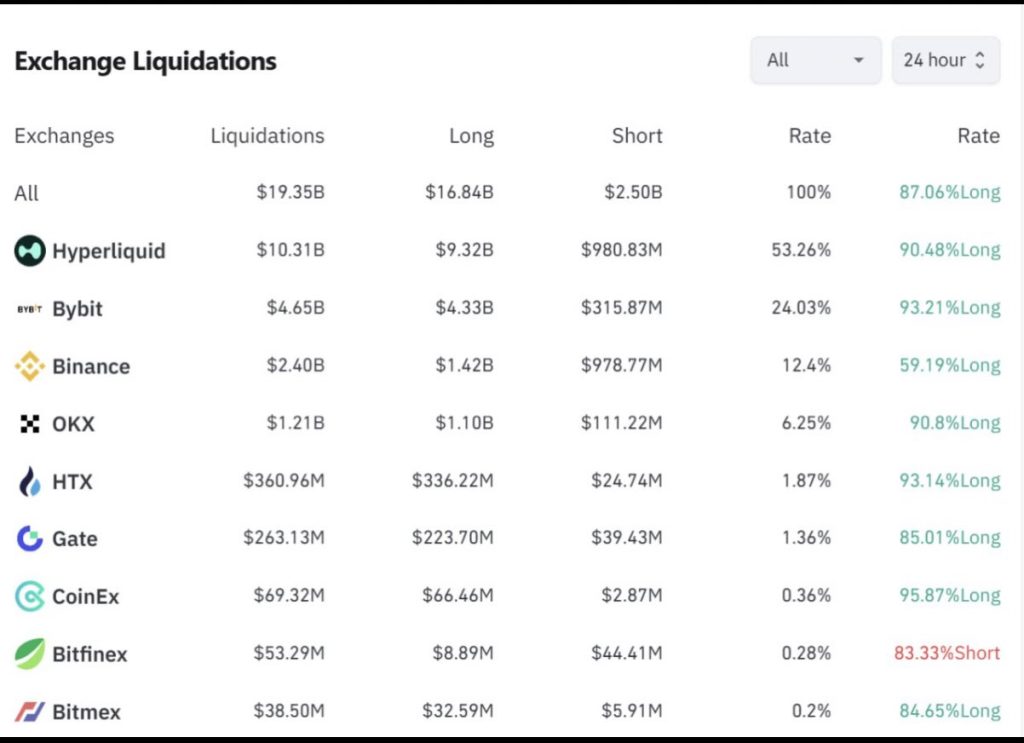CoinGlass data shows that liquidations on Hyperliquid, Bybit, and Binance accounted for most of the $19 billion purge that occurred between Oct. 10 and Oct. 11.