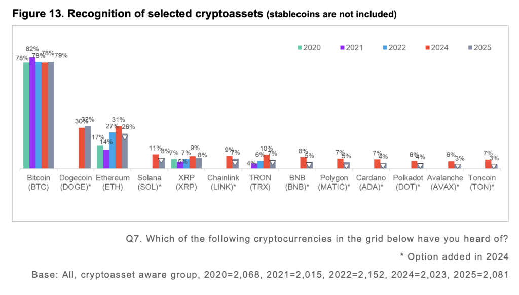 Low levels of recognition of altcoins among the British public is particularly telling. Just 8% of those polled said they had heard of Solana and XRP, falling to 7% for Chainlink and TRON, and 5% for the likes of BNB and Cardano. This powerfully illustrates how difficult it can be for newer digital assets to cut through the noise and gain meaningful market share.
