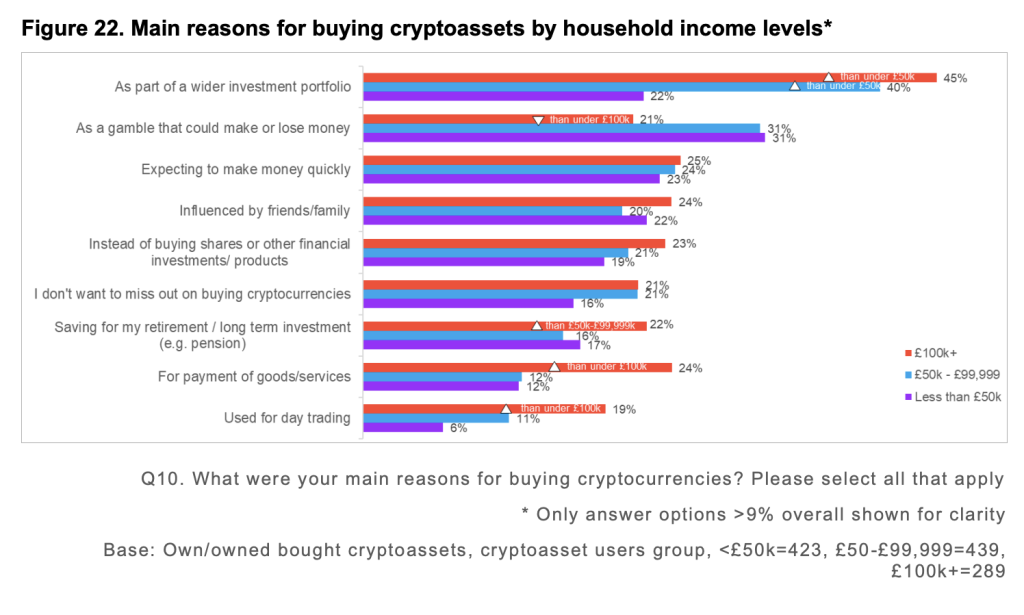 It’s also interesting to look at the motivations of those dabbling in digital assets — with those who have a household income of £50,000 or more saying their main ambition is to diversify their portfolio. Fascinatingly, those who have the highest annual earnings (that’s above £100,000) say they are buying cryptocurrencies in order to save for their retirement. This is despite regulatory warnings about their volatility.