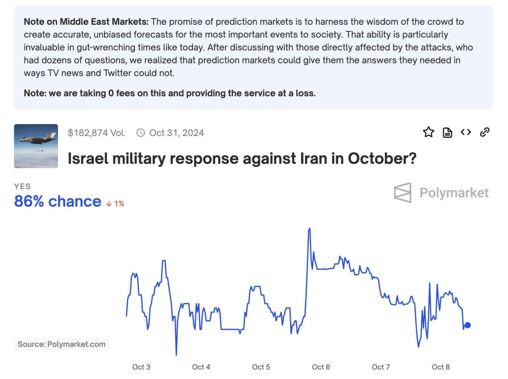 A cursory glance at the Middle East section of Polymarket illustrates the problem, with hundreds of thousands of dollars gambled on how Israel may retaliate after Iran fired an estimated 200 missiles toward the country last week.