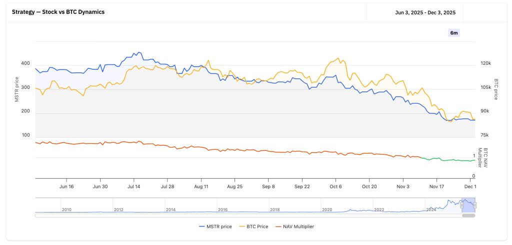 “Once a company in this position trades at a discount to its assets, equity issuance becomes dilutive, refinancing becomes more expensive, and the entire mechanism of leveraging its balance sheet to acquire more Bitcoin becomes much harder to sustain.”