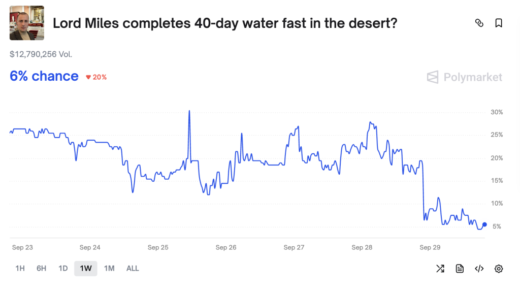 As things stand, the odds on Polymarket have now slumped even further — and at the time of writing, there’s just a 6% chance that Lord Miles will successfully complete the fast as planned. Trading volumes have now surged to $12.7 million, a $4 million rise compared with when we first brought you this story.