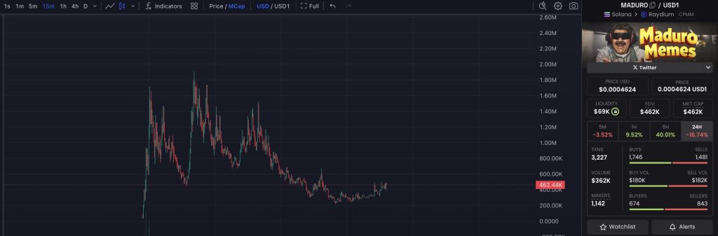 One example is the MADURO token. Its market capitalization climbed to nearly $2 million. Many of these tokens usually migrate from around $60,000 in market cap. Based on that, this move represents a growth of roughly 3,200%.