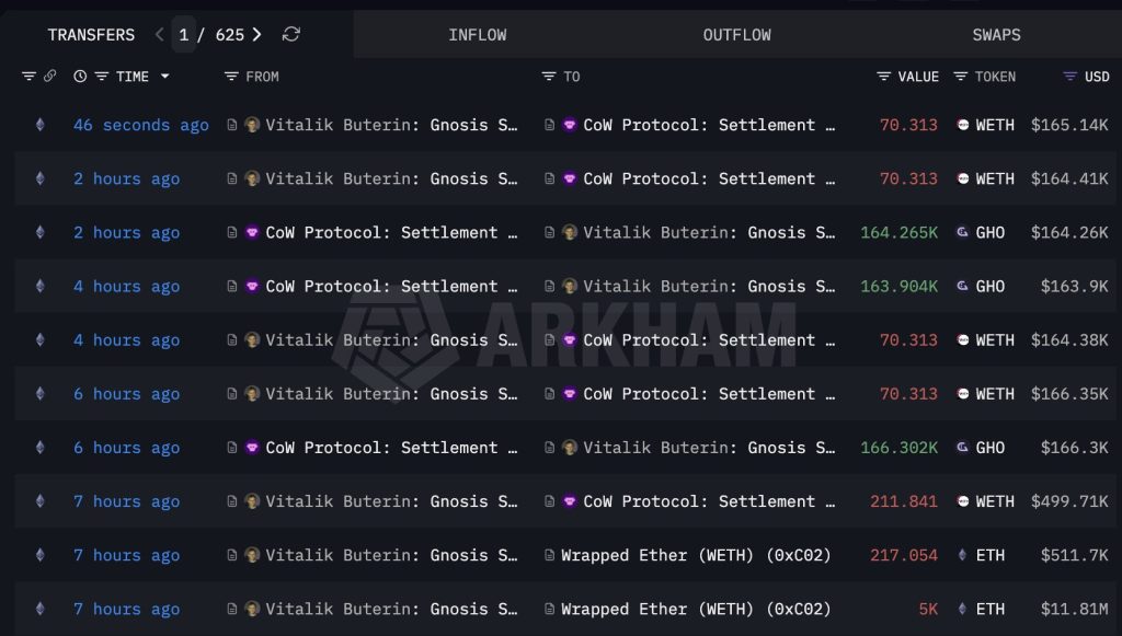 The wallet, believed to be linked to Buterin, executed several sell-related transactions. The first sale involved 211.84 ETH. Shortly after, the wallet transferred $500,000 in USDC to Kanro, a biotech charity founded by Buterin in 2023. The organization focuses on research related to COVID and future pandemics.