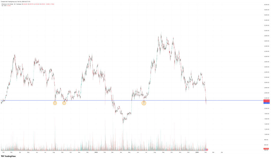 Now, however, conditions look more fragile. Negative sentiment, ongoing geopolitical tension, and investor fatigue after months of drawdowns since October 2025 all raise the risk of this level breaking. Still, historical price action suggests ETH has often found support here. For now, both scenarios remain on the table.