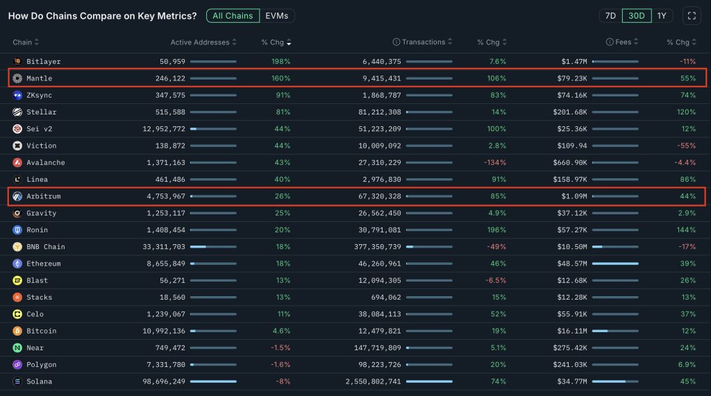 Network metrics also point to increased activity. According to Nansen, Mantle ranked second in active user growth over the past 30 days. Both transaction volume and network fees rose, signaling renewed usage. Mantle even outperformed its competitor Arbitrum (ARB) in user growth, though both posted similar fee volumes.