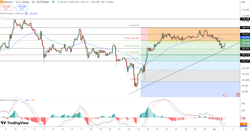Bitcoin on tällä hetkellä noin 107 000 dollarissa, toipuen 61,8 % Fibonacci-tasolta, joka on 103 270 dollaria. Nouseva trendiviiva 23. kesäkuuta muodostuneesta pohjasta (n. 99 775 $) on edelleen voimassa, ja hinta testaa 50 EMA -tasoa, joka on 106 898 dollaria.