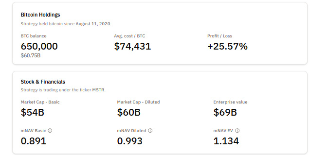 Markkinoiden nettovarallisuusarvojen mukaan yhtiön osake käy tällä hetkellä kauppaa lähes Bitcoin-omistusten arvolla. Perus mNAV on 0,892, laimennettu mNAV 0,994 ja yritysarvoon perustuva mNAV 1,136, mikä heijastaa velkojen ja etuosakkeiden vaikutusta.