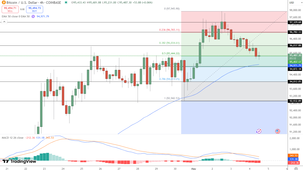 Tekniset indikaattorit viittaavat siihen, että Bitcoin tulee pitämään pintansa 50 jakson EMA:n (94 971 dollaria) ja 94 872 dollarin tukitason yläpuolella.
