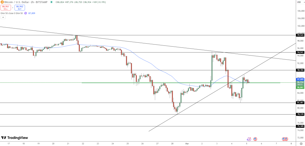 Tällä hetkellä se käy kauppaa noin 87 000 dollarissa, noustuaan päivänsisäisestä pohjalukemastaan 81 500 dollaria. Aluksi kryptovaluutta nousi 95 000 dollariin, vauhdittuen spekulaatioista koskien Trumpin “kryptovaluuttojen strateginen reservi” -aloitetta, mutta kääntyi nopeasti laskuun myyntipaineen kasvaessa.