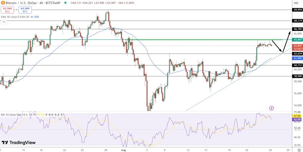 Alaspäin välitön tuki sijaitsee 62 654 dollarissa, joka on linjassa ylöspäin suuntautuvan trendiviivan kanssa. Tämä taso herättää todennäköisesti ostokiinnostusta, kun kauppiaat pyrkivät hyödyntämään mahdollisia vetäytymisiä.