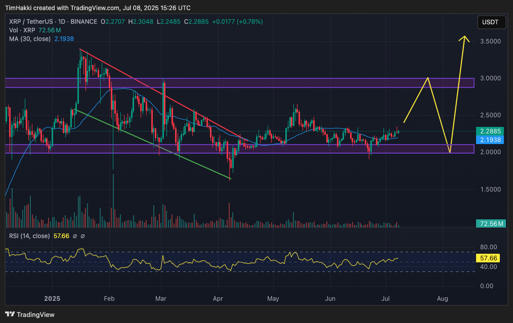 Lyhyellä aikavälillä noin kolmen dollarin vastustaso on keskeinen kynnys. Sen murtaminen voisi avata tien kohti viiden dollarin tasoa – joka on pörssi Geminin konservatiivisin tavoite – vielä ennen vuoden loppua. Tämä tarkoittaisi, että XRP voisi ylittää aiemman, vuoden 2018 huippunsa 3,40 dollaria jo ennen talvea.