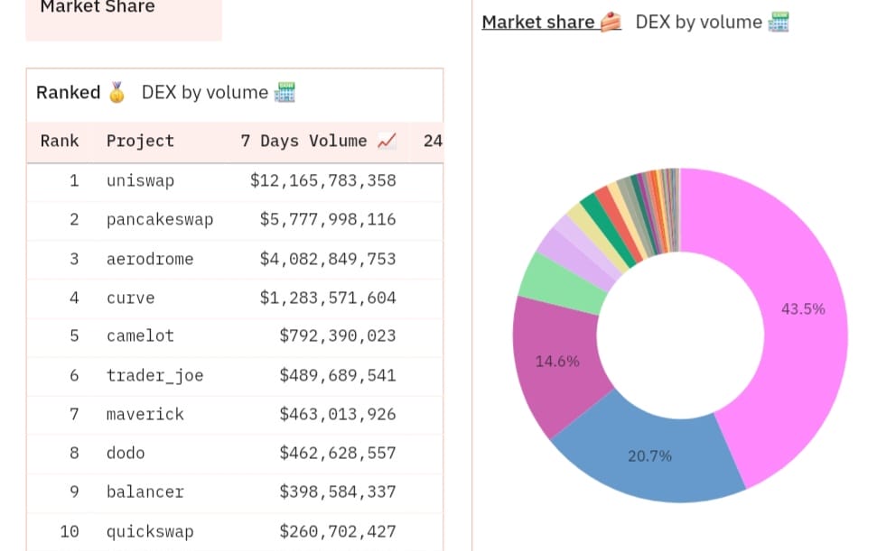 Dune Analyticsin mukaan Uniswapin osuus Ethereumin DEX-kauppavolyymista on noin 44 prosenttia. Se on myös kerännyt elinaikanaan 3,8 miljardia dollaria maksuja, ja UNI-tokenin haltijat vaativat osuutta tuloista.