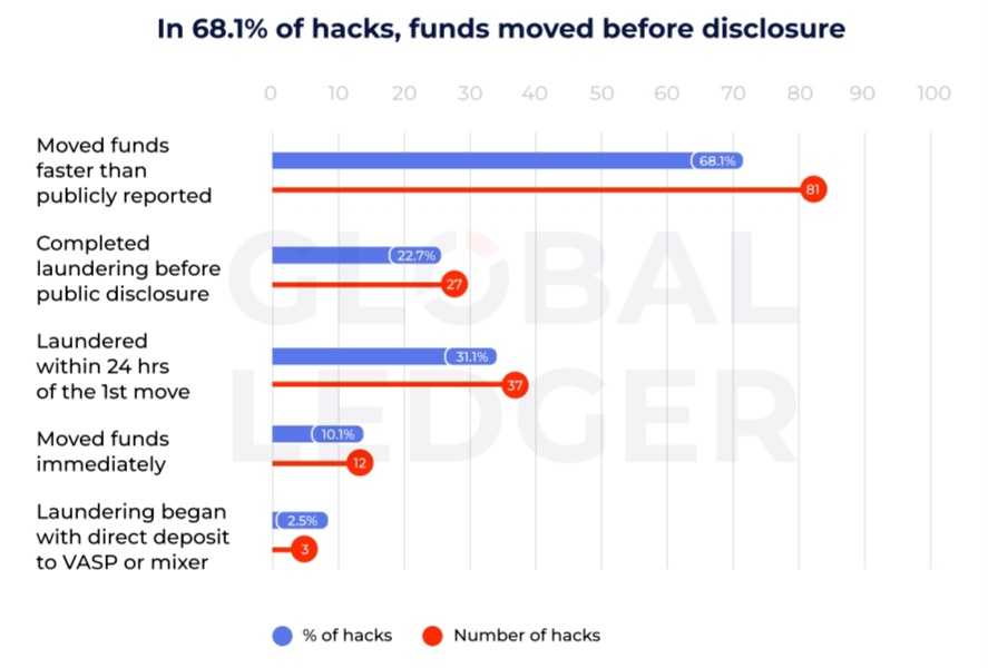 Global Ledgerin toimitusjohtaja ja toinen perustaja Lex Fisun huomautti, että yli 68 %:ssa tapauksista hakkerit siirsivät varoja ennen kuin hyökkäyksestä tiedettiin julkisesti.