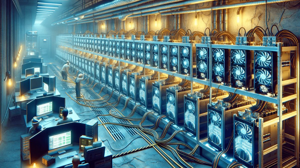 Spot Bitcoin ETF voi aiheuttaa harmia louhintayhtiöiden osakkeille. Dall-E:n tekemä kuvituskuva bitcoin louhinnasta.