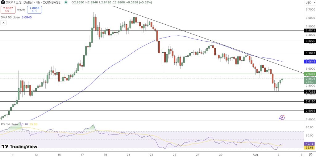Teknisestä näkökulmasta XRP-hintaennuste vaikuttaa laskevalta, sillä 4 tunnin kaaviossa kolikko on jäänyt laskevan trendilinjan ja 50-jakson liukuvan keskiarvon (SMA), joka on 3,08 dollaria, alapuolelle. Nämä tasot toimivat nyt vastuksena laskun jälkeen 2,93 dollarista.
