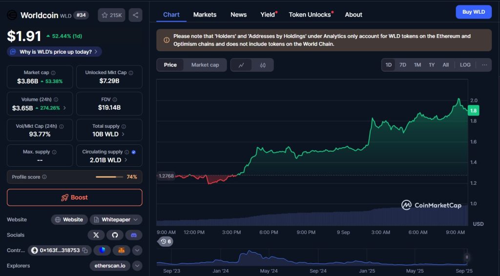 Forcément, la réaction du marché crypto ne s’est pas fait attendre. Le token Worldcoin (WLD) a bondi de plus de +50 % en une seule journée, passant au-dessus des 1,90 $, et atteignant une capitalisation estimée à près de 3,7 milliards de dollars.