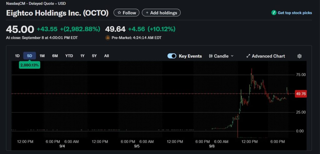 Vous ne connaissiez sans doute pas Eightco hier… et pourtant, en une journée, cette petite société cotée au Nasdaq est devenue la star de Wall Street. Son action a grimpé de plus de +2000 %, avec même un pic à +5600 % en intraday, avant de se stabiliser.