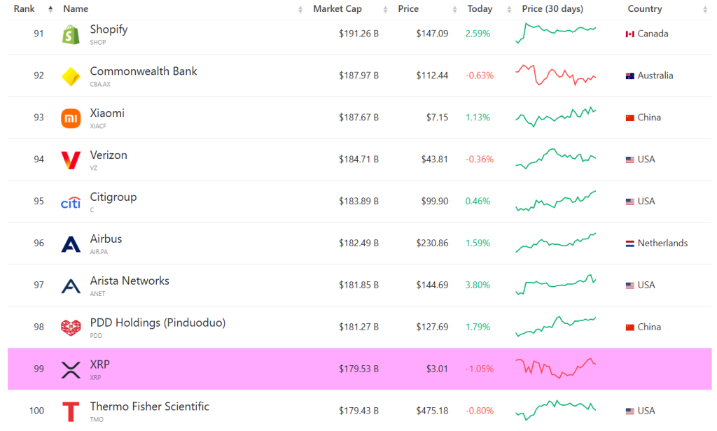 Cette dynamique a propulsé le jeton devant les actions de plusieurs entreprises cotées. À titre de comparaison, le XRP dépasse aujourd’hui la capitalisation de certaines banques régionales américaines et talonne déjà des conglomérats industriels. Cette percée confirme que l’actif n’est plus seulement un “altcoin” seulement bon à faire de la spéculation.