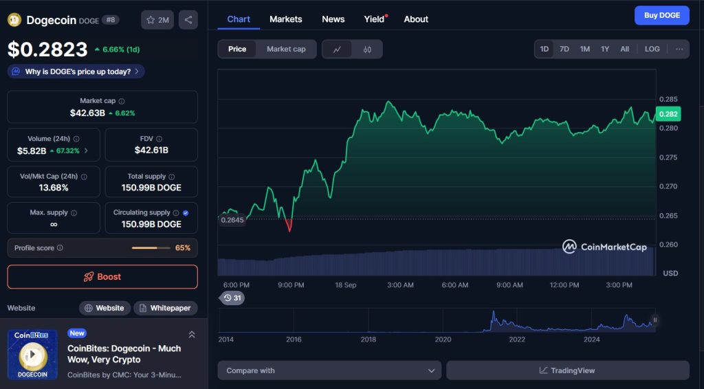 À l’ouverture, le prix de Dogecoin (DOGE) a bondi en quelques minutes, atteignant 0,2823 $. Les volumes échangés ont explosé, dépassant les 5,81 milliards de dollars en 24h, confirmant l’euphorie des investisseurs.