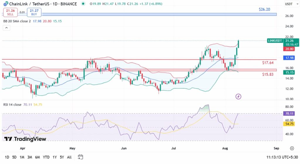 Actuellement, le LINK évolue autour de 21,70 $, avec une capitalisation de 14,70 milliards de dollars et 1,56 milliard échangé en 24 heures. La rupture du seuil psychologique de 21 $ a confirmé un basculement haussier de la structure de marché. Le prix se maintient désormais au-dessus des supports clés après un sommet journalier à 21,24 $ et un plancher à 18,78 $.