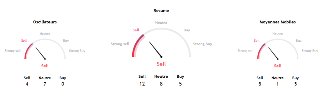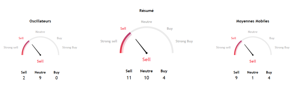 Les indicateurs techniques confirment la pression vendeuse. Son RSI tombe à 41, en zone franchement baissière. La dynamique est négative, sans pour autant atteindre le seuil de survente à 30, ce qui laisse craindre que la purge ne soit pas terminée.